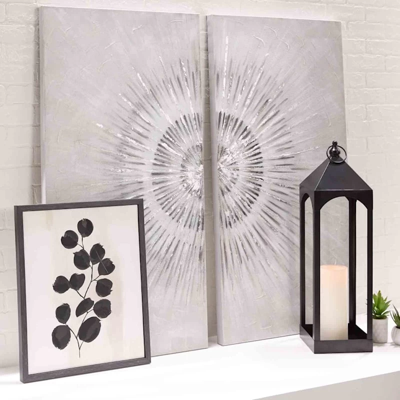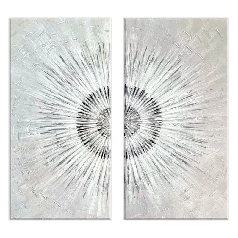 They say beauty is in the eye of the beholder. Art is too. Add a little character to any room in your home with our 24x48in. 2-piece textured silver starburst canvas wall art. The possibilities are endless with this grey, white, ivory and silver multi wall decor. A multicolor abstract metallic starburst motif creates visual interest against a visually interesting backdrop. Hang this wall decor to make a bold statement and to add a touch of personality to your home decor.