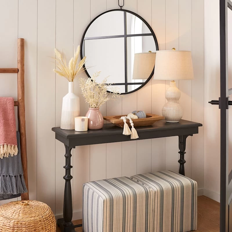 Modern farmhouse meets At Home prices in Honeybloom, our exclusive new brand that celebrates life lived together. Mirrors are a great way to add visual depth, which in turn makes a small room feel larger. Boost the overall appearance of your living room with a piece that will make your space feel even brighter. Our 30in. round metal wall mirror is versatile piece that’s ideal for frequently traveled areas within your home; it’s not just for the living room. Its basic black metal frame has a look that will complement any decor choice.