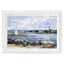 A jack-of-all-trades, including graphic designer, carpenter, contractor, author and beloved reality TV host, Ty Pennington has created a new and exclusive collection for At Home. This framed beach print is an easy way to add a pop of charm to any room. Bring new life to your patio, kitchen or den with this interesting 43x31in. sailboat and lighthouse hanging print. Featuring a blue, white and sand colorway in a whitewash frame, this picture will bring years of enjoyment and enhance any beach house setting.